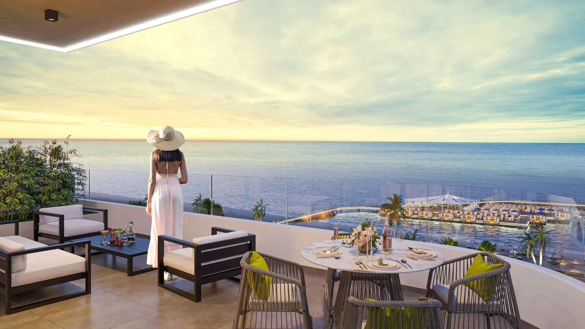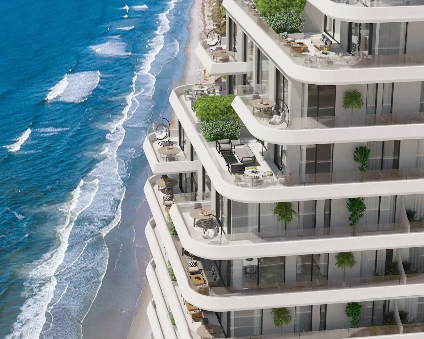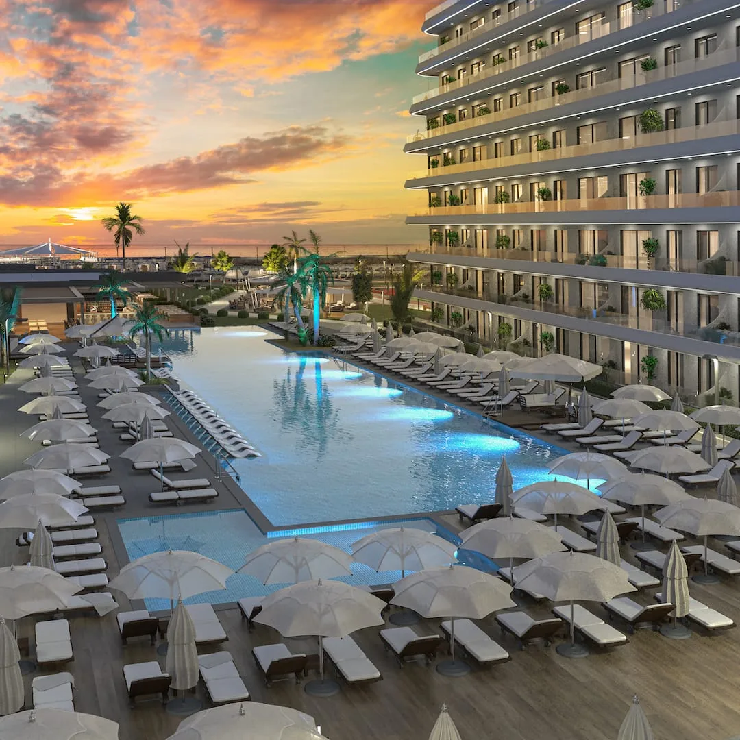 Alpcans A high-rise beachfront resort features a large pool surrounded by lounge chairs and umbrellas. The building has balconies with greenery, and the beach is visible in the background.